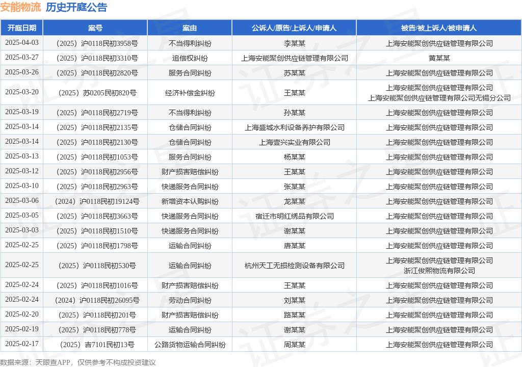 本站消息,根据天眼查APP显示,近日公布了一则上海安能聚创供应链管理有限公司作为被告/被上诉人的开庭公告,详细内容如下: